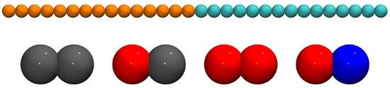 Coarse-grained (CG) models of di-BCP chains and NDs have been applied to generate ordered lamellar phases with specific NP content and chain-dimer interaction, as detailed in Section 2.2. By disregarding computationally expensive chemical details, CG models allow to simulate the mesoscale behaviour of materials, which fully evolves over considerable length and time scales. While of fundamental importance at the molecular scale, these degrees of freedom are less and less relevant at increasing time and length scales to determine, for instance, chain conformations and structural relaxation [62,72,73,74,75]. To coarse-grain a polymer chain, a small portion of the macromolecule is reduced to a single interaction site, here referred to as bead, whose interactions average the contributions of the atoms it comprises. More specifically, our model copolymer chain consists of beads separated into a head block (h) and a tail block (t) of 15 beads each. This value was chosen to obtain lamellar layers thicker than the size of the NDs and systems with enough polymer chains to minimise finite-size effects. At the same time, it is not too large to hamper the study of the long-time diffusive regime within our simulation time. Each chain bead has a diameter and a mass , which define, respectively, the system’s unit length and unit mass in Lennard–Jones (LJ) units. Additionally, NDs consist of two beads of diameter and mass , which are bonded to each other with a small overlap (see Section S1 of the Supplementary Materials for a detailed calculation of the NDs’ mass). Depending on their chemical affinity to the two chain blocks, ND beads can be head-like (H), tail-like (T) or neutral (0). A schematic representation of a copolymer chain and the full set of the NDs studied in this work is shown in Figure 1.