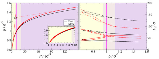 Isothermal curves at and pressure rates (black) and (red) obtained by expanding and then compressing between and . The continuous vertical line marks our system’s pressure and density (magenta). (Left) Pressure vs. density plane. It contains the isotherms (continues lines) and linear regressions of the slow-rate curve at each end (dashed and dotted red lines). Their intersection () distinguishes isotropic (light yellow area) from lamellar (yellow-purple mixed-coloured and purple areas) phases. The inset shows the same results in the low-density region. (Right) Box dimensions vs. density plane. It displays evolution of (dashed lines), (dashed-dotted lines) and (continuous lines) at the two pressure rates. An abrupt change in is observed at .