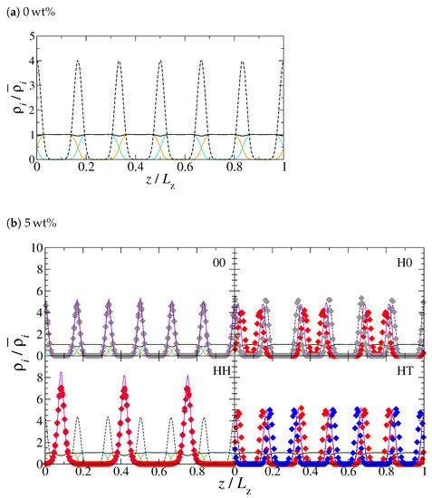 Density profiles of the pristine polymer (a) and the systems with 5 wt% particle mass fraction (b) in the z direction. The density profiles of h-block, t-block, chain beads and chains’ centre of mass are, respectively, indicated by orange, cyan, solid black and dashed black curves. The density profiles of H-like, T-like and neutral ND beads are represented as solid diamonds in red, blue and grey, respectively, and those of the NDs’ centre of mass as violet solid lines.