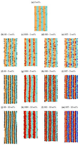 The incorporation of NDs into this di-BCP does not destroy its smectic liquid-crystalline ordering, even at the largest nanoparticle loading considered here (10 wt%). A visual representation of the resulting PNCs as obtained after equilibration is reported in Figure 4 (a perspective view of the same configurations is also provided in Figure S4). As a general tendency, all types of NDs tend to arrange at the interfaces formed by the two polymer blocks, except HH-NDs, which are preferentially located within the h-block layers, as observed in Figure 4c,g,k at 1, 5 and 10 wt%, respectively. This can also be appreciated in the density profiles reported in Figure 3b for PNCs with 5 wt% of NDs and Figure S3 for all the PNCs studied here. While most NDs are constrained within the inter-layer region and thus display a quasi-two-dimensional distribution, HH-NDs tend to occupy the whole space available within the h-block, sufficiently far from the interface with the t-block, and their distribution assumes a three-dimensional character. This difference is especially evident at larger particle loading, as revealed by the broader base of peaks formed by HH-NDs in Figure S3c. We note that qualitatively similar tendencies were observed by Pine and co-workers, who investigated gold nanoparticles coated with polystyrene (PS) in poly(styrene-b-2 vinylpyridine) di-BCPs [96]. Although these nanoparticles exhibit a roughly spherical shape, they form preferential interactions with the PS block, similarly to our HH-NDs with the polymer h block. The authors found the nanoparticles mostly in the centre of the PS domains, with Gaussian distribution profiles whose width decreases as the PS domain size decreases or as the particle weight fraction increases. In principle, this behaviour would also be expected for 00-NDs, whose neutral interactions with both copolymer blocks should promote their homogeneous distribution throughout the mesophase, and for H0-NDs, which form favourable interactions with the h-block, where they should preferentially and uniformly disperse. In fact, this is not the case.