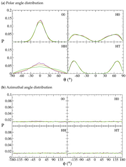 where is the unit vector defining the dimer orientation and are canonical vectors oriented as the cartesian axes of the simulation box. With the values yielded by Equations (4)–(6) and their standard deviation, a clear picture of the average dimer orientation can be obtained. Notice that Equation (5) helps discern whether results from Equation (4) are caused by uniformly or randomly oriented particles. The calculation of the distribution profiles along z of both polar and azimuthal angles, detailed in Section S3, is especially useful to understand the relation between position and orientation.