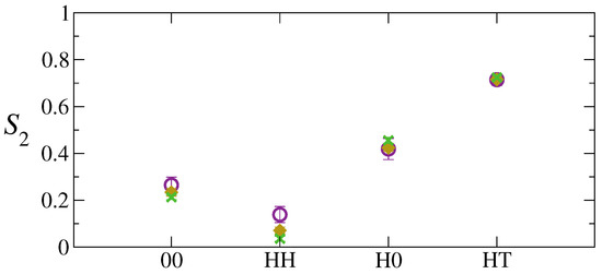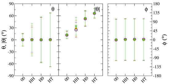 Polar (, ) and azimuthal () average angle values of particles (00, H0, HH and HT) at mass fractions wt% (empty purple circles), wt% (yellow diamonds) and wt% (green crosses).