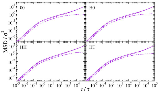 The time-step for all the simulations was fixed at , with the system’s unit time. Equilibration and production runs were performed in the isothermal-isobaric () ensemble, i.e., at constant temperature , with the Boltzmann constant, constant pressure and constant number of chains and dimers. To this end, a Nosé–Hoover barostat and thermostat were used [87,88].