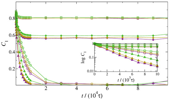 Time autocorrelation functions of the orientation of NDs. The inset provides a zoom at short time scales (notice the log-lin scale). Systems containing 00 (empty circles), HH (solid triangles), H0 (solid diamonds) and HT (empty squares) NDs are shown at particle mass fractions wt% (purple), wt% (yellow) and wt% (green).