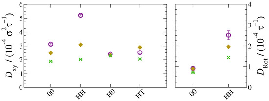 Translational diffusivity of NDs in the plane (left) and rotational diffusivity (right) for various particle mass fractions: wt% (purple empty circles), wt% (yellow full diamonds) and wt% (green crosses).