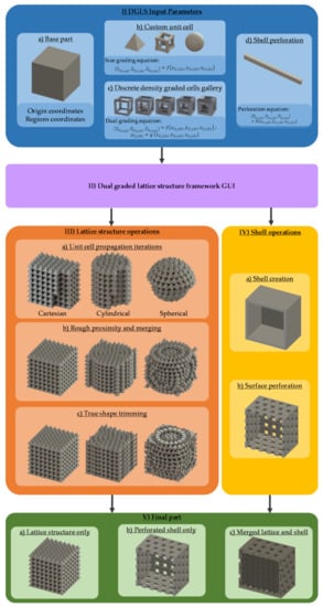 The dual graded lattice structure framework (DGLS) is developed to allow the user to vary/grade two properties of the unit cells simultaneously while generating the lattice structure. The DGLS algorithm consists of five main processes, as shown in Figure 2: