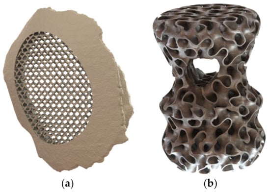 Constant size and relative density generated lattice structure for (a) skull implant partially filled with a cubic diamond lattice structure and (b) spline-based revolved artifact-filled gyroid.