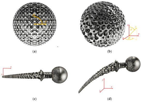For size grading, the first testing scenario was to fill a sphere base part with a size-graded topology-optimized FCC unit cell using a spherical coordinates system, as shown in Figure 4a,b. Each of the size grading governing equations depended on one unique coordinate axis only. This design allows for a spatially graded unit cell size with a varying aspect ratio while constraining each unit cell’s nodes to meet all neighbouring unit cells. The origin of the coordinate system was set to be in the center of the sphere. The unit cells’ Sx varied linearly in the radial direction with the largest size value at the center and decreased towards the sphere circumference. Simultaneously, the Sy slightly varied in the polar direction in a sinusoidal behavior as a function of the polar coordinate. The Sz was set to vary sinusoidally in the azimuthal direction. The second scenario was to partially infill a hip joint implant with a size-varying Schwartz D, which belongs to the TPMS unit cells using Cartesian coordinates, as shown in Figure 4c,d. The part was divided into six domains, some of the domains were left solid, and the others were infilled with the Schwartz D unit cell either with size graded or constant unit cells. The three size equations were dependent on the x-axis only. This design allows for a fixed aspect ratio while applying the size grading.