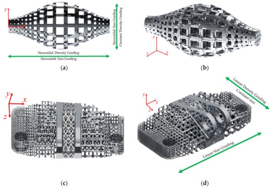 Another advantage of additive manufacturing is the functional grading of the lattice structures, materials, and microstructures [17]. Functionally graded structures offer part optimization and property tailoring over the part domain, such as tuning a part’s natural frequency [49] or thermal conductivity [50] while maintaining the part strength. Moderate relative density grading was found to improve the stiffness of the part significantly [51]. Size grading has improved energy absorption in some loading directions and did not affect other directions. Relative density grading was confirmed with another study to be the most significant parameter to control the part stiffness and energy absorption [52,53]. The grading equation was shown to affect the part’s behavior, for example, linear or harmonic grading [54].