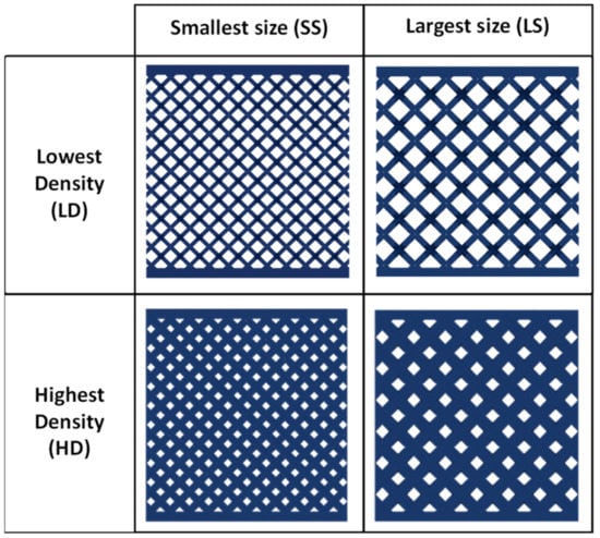 The first experiment studies the effect of the unit cell’s size and relative density on the whole lattice structure’s mechanical properties. This experiment is considered a control experiment for the design domain boundary; the mechanical property values evaluated in this experiment are expected not to be exceeded by all the dual graded designs within the mentioned design envelop. The specimens in this experiment have a constant relative density and constant cell size unit cells. This experiment consists of four lattice structure designs using the upper and lower values of the relative density and size used in this investigation, as shown in Figure 8. The first boundary design has a 3.5 mm cell size and 24% relative density, which means that this design uses the smallest unit cell size (SS) and the lowest cell relative density (LD) of all the values used in this investigation. The second boundary design has the largest cell size (LS), of 6.5 mm, while having the lowest cell relative density (LD) used in this investigation. The third has the smallest cell size and the highest cell relative density (HD) of 63%. The fourth design has the largest cell size (LS) and the highest relative density (HD).