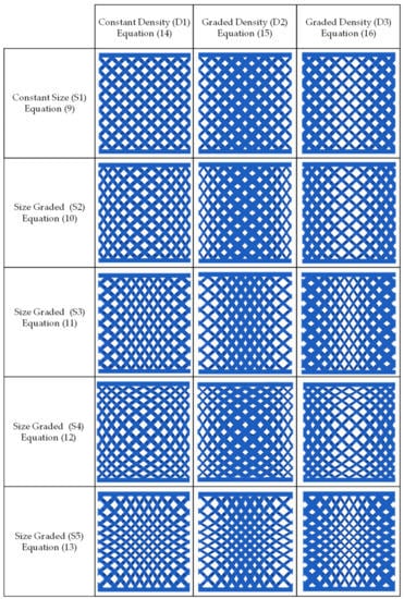 describe a three-dimensional size grading spatially. The design of Equation (12) starts with a large unit cell size in the middle of the cube, and it decreases towards the cube edges along the x, y, and z axes. The size grading design described by (12) will be referred to as S4. While Equation (13) has the smallest unit cell in the middle of the cube, and its size increases along the three axes towards the edges. The size grading design described by (13) will be referred to as S5. The aspect ratio of both the (S4) and (S5) designs vary along the three axes. However, the cells along the planar and spatial diagonals have a 1:1 aspect ratio. The geometry produced by the different size grading equation sets can be seen independently of any relative density grading in the first column of Figure 9.