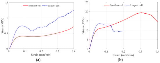 The boundary lattice structure design experimental results are presented in Table 1. The relative density of the unit cell has the most significant influence on the compressive strength. The increase in the unit cell relative density from 24% to 63% leads to double the increase in the whole specimen volume ratio, which is the ratio between the lattice structure volume and the occupied solid volume domain. The average strength and modulus of elasticity increased over 20 times. The stress-strain curves for the boundary-designed lattice structure using the lowest and highest unit cell relative density are shown in Figure 10a,b, respectively. Comparing these two figures, as the cell size increases at the same relative density, the compressive strength and the modulus of elasticity increase. The increase in the mechanical properties values is comparatively high at lower unit cell relative density. However, at higher relative densities, the mechanical properties values do not increase significantly.
