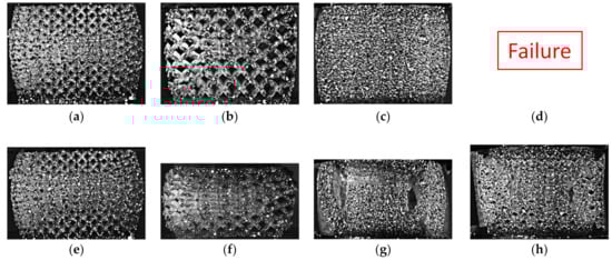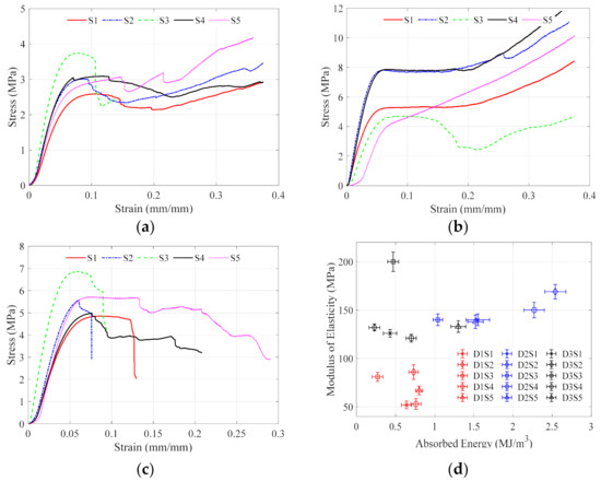 Compression tests were carried out using INSTRON 5966, Instron, MA, USA, universal testing systems for most specimens except six designs that exceeded 10 kN loading force. These were tested on an MTS 810 with 100 kN loading force capacity. The compression test was run at a loading speed of 1 mm/min without preloading, as recommended by ISO 604:2002(E) [75]. The compressive strength and the elastic modulus were determined based on the ISO standard criteria for rigid cellular plastic materials, ISO 844:2014(E) [73]. The compressive strength value equals the maximum compressive stress occurring before 10% compressive strain. Otherwise, it is equal to the stress corresponding to 10% compressive strain. The absorbed energy is not described in the previous standard. However, the ISO standard for cellular metal material, ISO 13314:2011(E) [76], describes it. The absorbed energy was calculated as the area under the stress-strain curve till the densification or 50% compressive strain. A failure is considered if the stress dropped 40% within a short time or after the compressive strain reaches 40%.