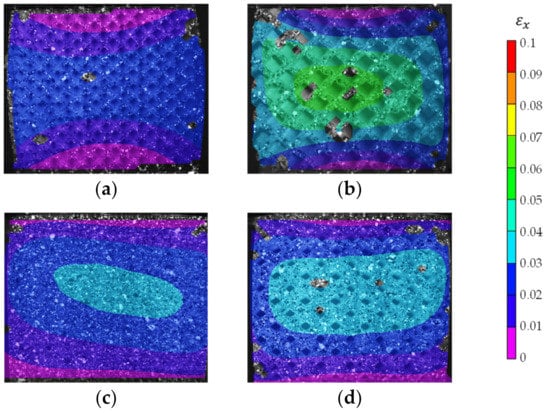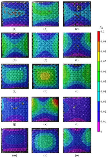Testing was captured at one frame per second, which means that each frame was capturing a compressive displacement of around 20 µm based on the loading rate of 1 mm/min. The specimens were sprayed with black and white spray paint to create a scattered speckle pattern on the lattice specimen’s front face. Before each test, a DIC calibration process was carried out by capturing a calibration pattern consisting of 8 × 8 circular dots with a 4 mm diameter at several spatial rotations. The calibration and the test images were captured using VIC-Snap software, V7.0, Correlated Solutions, SC, USA. Moreover, the image processing and data analysis were performed using VIC-3D software by Correlated Solutions. The average calibration score was around 0.06, with a maximum value of 0.08 and a minimum value of 0.04. The subset was tuned for each specimen to minimize the projection error; the maximum subset value was 67 × 67 pixels, and the minimum value was 35 × 35 pixels. The step value was set to 11 pixels. The average projection error equals 0.1, with a maximum value of 0.46 and a minimum value of 0.021.
