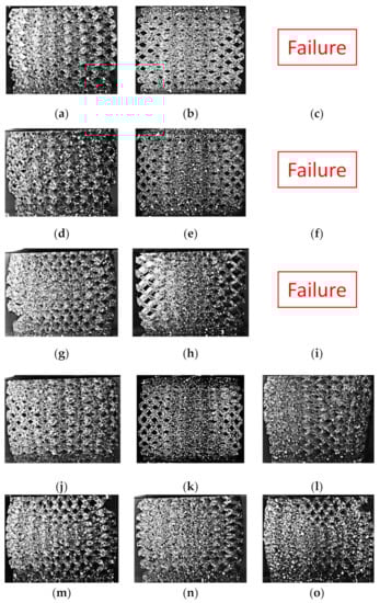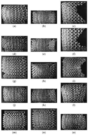 Deformation of the functionally graded lattices at the end of the compression test: (a) D1S1, (b) D2S1, (c) D3S1, (d) D1S2, (e) D2S2, (f) D3S2, (g) D1S3, (h) D2S3, (i) D3S3, (j) D1S4, (k) D2S4, (l) D3S4, (m) D1S5, (n) D2S5, and (o) D3S5.