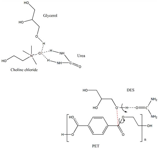 Ternary DES has been reported as a new type of DES to widen the range of DES applications owing to the extra functionality provided by their components. One pertinent area where ternary DESs were recently applied is CO2 capture, which demonstrates that DESs have great flexibility in terms of synthesis, forms, and applications []. In the current study, we selected a green ternary DES with ChCl as a hydrogen bond acceptor and glycerol and urea as hydrogen bond donors to provide an initial depolymerization of PET when coupled with MW irradiation and to facilitate PET enzymatic hydrolysis. A schematic diagram of the proposed interactions of DES with PET is demonstrated in Figure 1. The advantage of this DES lies in its components being green, inexpensive, and largely available with the capacity to provide synergistic effects on PET depolymerization [,,,]. As shown in Figure 1, depolymerization of PET is postulated to involve a form of glycolysis reaction due to the presence of glycerol within the ternary DES []. It is also known that a quaternary ammonium compound, such as ChCl and DES itself, could act as a catalyst in mild glycolysis [,,,]. Simultaneously, the H-bond action between glycerol and urea is expected to change the charge density of the hydroxyl (OH) group in glycerol and increase the electronegativity of the oxygen atom in the glycerol OH group. Hence, the nucleophilicity of the oxygen becomes stronger, thereby supporting preferential attack to the carbon of the ester group in PET [,].
