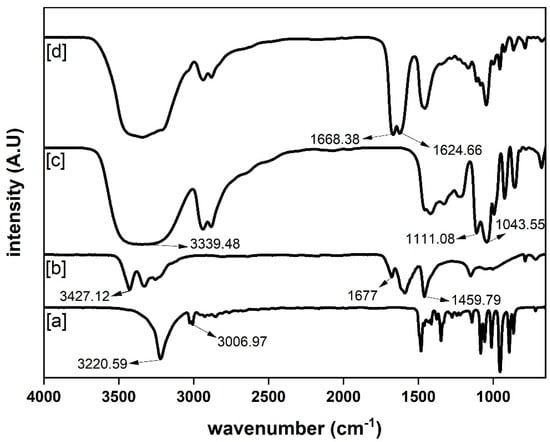FTIR spectra of: (a) choline chloride, (b) urea, (c) glycerol, and (d) DES (choline chloride/urea/glycerol in the ratio of 1:1:1).