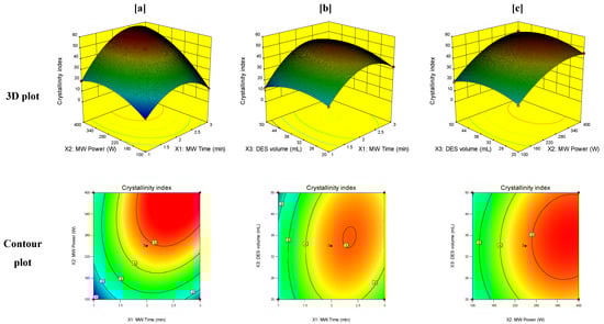 3D and contour plots of the effect of the interaction of (a) MW time (X1) and MW power (X2), (b) MW time (X1) and volume of DES (X3), and (c) MW power (X2) and volume of DES (X3) on the crystallinity index.