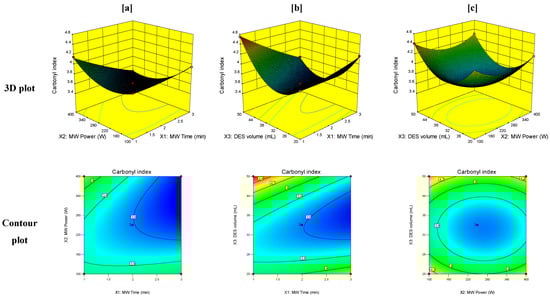 3D and contour plots of the effect of the interaction of (a) MW time (X1) and MW power (X2), (b) MW time (X1) and volume of DES (X3), and (c) MW power (X2) and volume of DES (X3) on the carbonyl index.