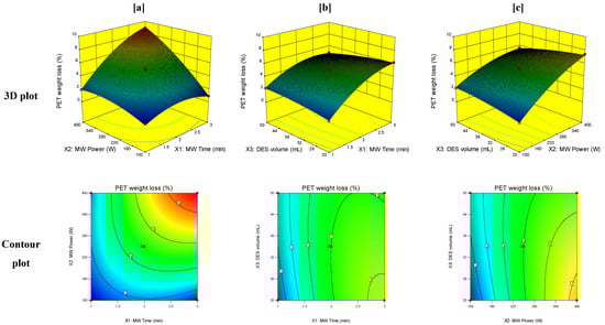 3D and contour plots of the effect of the interaction of (a) MW time (X1) and MW power (X2), (b) MW time (X1) and volume of DES (X3), and (c) MW power (X2) and volume of DES (X3) on PET weight loss (%).