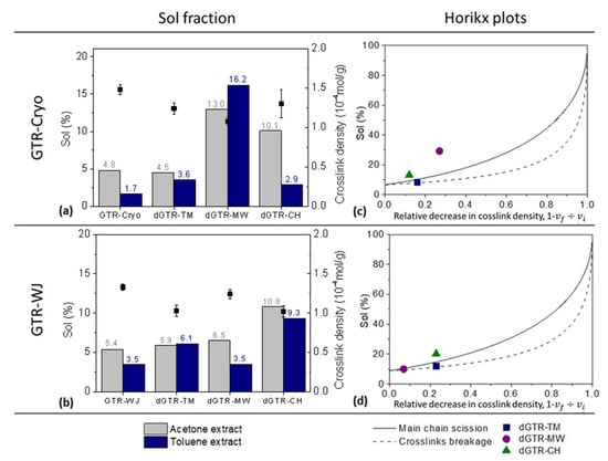 - Verbruggen, M.A.L.; van der Does, L.; Dierkes, W.K.; Noordermeer, J.W.M. Experimental validation of the Charlesby and Horikx models applied to de-vulcanization of sulfur and peroxide vulcanizates of NR and EPDM. Rubber Chem. Technol. 2016, 89, 671–688. [Google Scholar] [CrossRef]