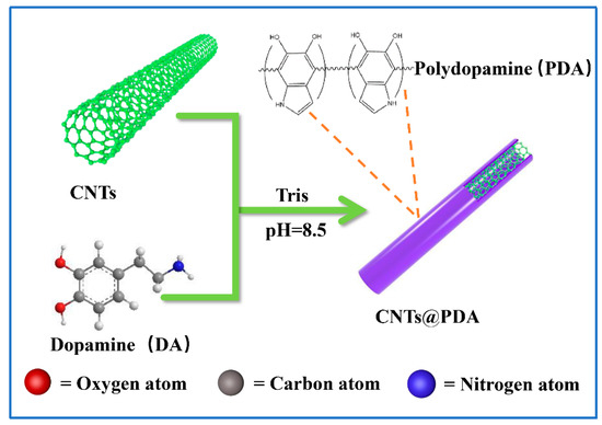 First, 600 mg of CNTs were added to 900 mL of deionized water. After ultrasonic dispersion for 30 min, 360 mg of dopamine was added under magnetic stirring, and the solution was stirred at room temperature for 20 min. Then, 100 mL Tris (1.21 g) aqueous solution was added, the temperature was adjusted to 60 °C, and the stirring continued for 8 h. The final product was centrifuged several times (3500× g r/min) and washed with deionized water until the filtrate was colorless. Then, it was dried in a vacuum oven at 60 °C for 24 h to obtain the CNTs@PDA nano-filler. The preparation process of the CNTs@PDA nano-filler is shown in Figure 1.