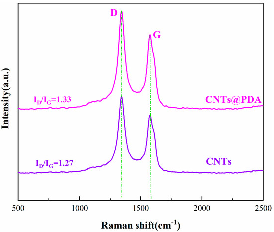 Raman spectroscopy can distinguish between the hybrid forms of carbon atoms and is also an effective method to examine the structural characteristics of CNTs. The Raman spectra of the CNTs and the CNTs@PDA were both double peaks, as shown in Figure 4. The Raman spectra of CNTs showed a D band (1334 cm−1) and a G band (1581 cm−1), indicating that the graphitic structure was preserved in CNTs and CNTs@PDA [39]. If R is defined as the intensity ratio of peak D to peak G, the value of R can reflect the functionalization degree and the integrity of the CNTs graphite structure [40]. After calculation, the R values of the CNTs and the CNTs@PDA were 1.27 and 1.33, respectively. In contrast, the R value of the CNTs@PDA was only slightly greater than that of the CNTs, which was due to the introduction of extra heteroatoms (N), resulting in the decomposition of the graphitic structure, producing more defects and disordered areas within CNTs [41].