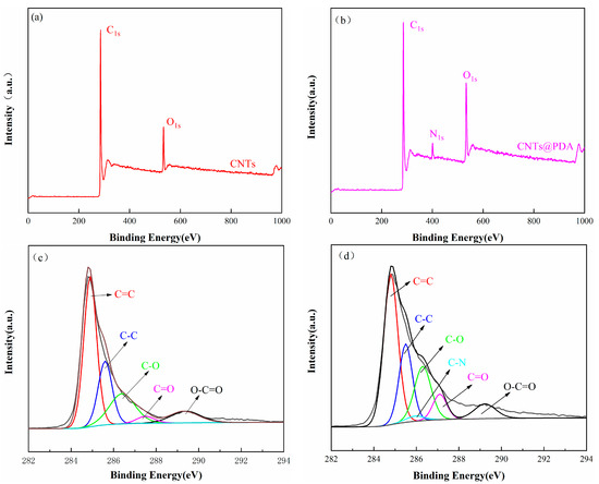 (a) XPS survey spectra of CNTs and (b) CNTs@PDA; C1s XPS spectra of (c) CNTs and (d) CNTs@PDA.