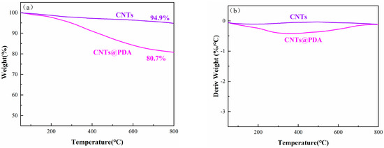 The thermal stability of the CNTs@PDA was characterized by thermogravimetric analyzer. Figure 6 shows the thermogravimetric curves of the CNTs and the CNTs@PDA. As shown in the figure, the unmodified CNTs did not show significant weight loss during the whole thermal analysis process, which was in line with the excellent heat resistance characteristics of carbon nanomaterials. While the CNTs@PDA had begun to show weight loss at 250 °C, they had an obvious weight loss between 300 and 600 °C, which was mainly due to the thermal decomposition of the polydopamine. When the temperature increased to 800 °C, the thermal weight loss of the CNTs@PDA accounted for about 19.3% of the total weight, showing that the PDA had been successfully coated on the surface of the CNTs.