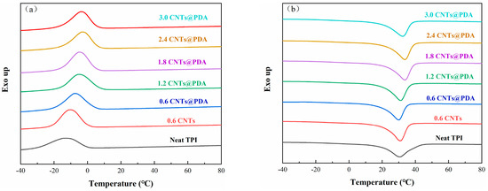 DSC curves of TPI composites: (a) cooling curves and (b) heating curves.