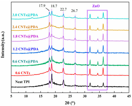 The TPI was a partially crystalline polymer material, which had two crystal forms: α and β. As shown in the XRD pattern in Figure 8, there were obvious characteristic peaks in the TPI composite material, of which the XRD diffraction angles (2θ) of the α and β crystal forms were 17.9 (α), 26.7 (α), 18.7 (β), and 22.7 (β) [43]. The three peaks between 30° and 40° corresponded to the characteristic peaks of ZnO [44]. In addition, there were no new crystallization peaks in the XRD curves of all the samples, which indicated that the crystal structure of the TPI composites had not been destroyed.