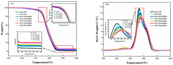 The DTG curve showed that the CNTs@PDA not only promoted the formation of carbon but also slowed down the mass loss rate of the TPI composites during their degradation at high temperatures. The further decomposition of the matrix was delayed, and the carbon yield was increased, which had a positive effect on the thermal stability of the composites.