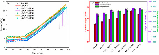 (a) Stress–strain curves; (b) average stress, elongation-at-break and Young’s modulus of TPI composites with various CNTs@PDA hybrid loadings.