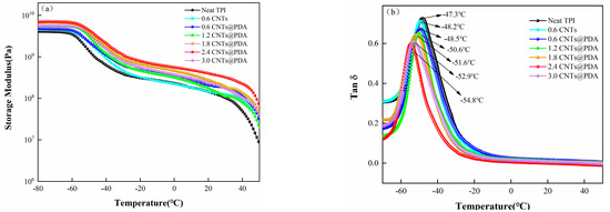 The DMA curves of the storage modulus (E′) and the loss factor (tan δ) versus the temperature of the samples are shown in Figure 11. Below the glass transition temperature (Tg), the addition of CNTs increased the storage modulus (E’) of the TPI composite, as shown in Figure 11a. This result is associated with the hindered movement of the cross-linked molecular chain when CNTs were added into the TPI matrix. In addition, due to the high rigidity of the CNTs, they acted as a skeleton, which led to the improvement of the rigidity of the composites and was reflected by the increased energy storage modulus. As compared to the TPI/CNTs, the E’ of the TPI/CNTs@PDA composites increased when the same content of the CNTs@PDA had been added. This was due to the abundant amounts of amine and catechol groups in the PDA coating layer, which improved the interface interaction between the CNTs@PDA surface and the TPI matrix [47]. However, when the amount of CNTs@PDA exceeded 2.4 phr, the E’ of the composites decreased due to the abundant catechol groups, which not only promoted the dispersions of the CNTs in the TPI matrix but also enabled hydrogen bonding between the PDA coating layers. This resulted in a bridge between the CNTs and, therefore, their agglomeration and resultant defects. These defects formed stress concentration points in the matrix, leading to a decrease in E’. Figure 11b shows that when CNTs@PDA was added to the composites, the Tg was −48.5 °C, a reduction of 1.2 °C, as compared to the neat TPI. Tg gradually decreased and trended downward when the element content was increased, which in turn increased the distance between the molecular chains and promoted their movement. In addition, with the continuous increase in CNTs@PDA content, the loss factor of the samples tended to decrease, and the loss factor of the samples were lower than that of the neat TPI.