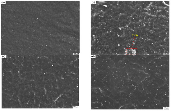 The dispersion state of the nano-fillers in the composites had an impact on their mechanical properties. To further study the dispersion and aggregation of the CNTs@PDA in the TPI, the sectional morphology of the composite was investigated with SEM. The cross-section of the neat TPI was relatively flat and smooth with typical brittle fracture characteristics. Figure 12b shows that the CNTs had a large-scale aggregation, and the cross-section became coarser, as compared to that of the neat TPI. Even though they had the same additional contents, the cross-section of the TPI/CNTs@PDA composites had no aggregation, indicating that the PDA further improved the dispersion of the CNTs in the TPI matrix. In addition, with the gradually increased CNTs@PDA content, a large number of small cracks appeared in the composite, and the density and depth gradually increased. This fracture behavior was due to the strong interfacial interaction between the PDA-modified CNTs and the TPI matrix. More effective stress was transferred from the TPI matrix to the CNTs with high modulus, which inhibited the crack propagation in the matrix on a larger scale, leading to the roughness seen in the cross-section of the composites. The addition of the PDA-coated CNTs improved the fracture toughness of the TPI matrix. However, when the content of CNTs@PDA exceeded 2.4 phr, there was still some small-scale aggregation, and the crack density decreased to a certain extent, as shown in Figure 12g. The suggested cause for this could be that with the increased packing content, the CNTs coated with PDA could still have had a strong association with each other, which could have led to their weak dispersion in the TPI matrix.