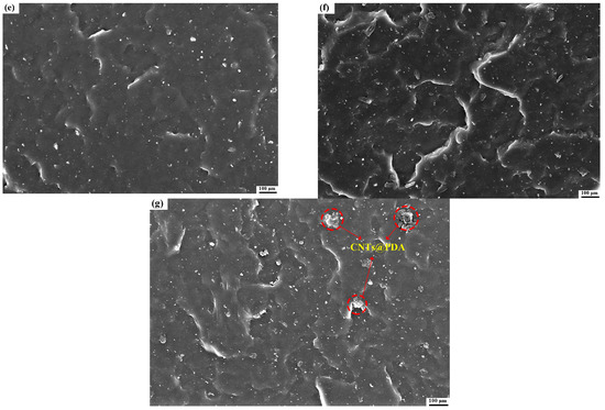 SEM images of fracture sections of TPI composites: (a) Neat TPI; (b) TPI with 0.6 phr CNTs; (c) TPI with 0.6 phr CNTs@PDA; (d) TPI with 1.2 phr CNTs@PDA; (e) TPI with 1.8 phr CNTs@PDA; (f) TPI with 2.4 phr CNTs@PDA; and (g) TPI with 3.0 phr CNTs@PDA.