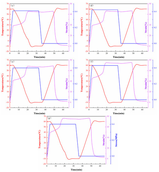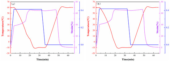 The shape-memory properties of the composites were analyzed by DMA. Firstly, the samples were equilibrated at 60 °C and then stretched at a stress of 0.4 MPa. Secondly, the sample was maintained at a constant stress and cooled down to −10 °C quickly, equilibrated at this temperature for 5 min, and then the stress was removed. In the last step, the samples were heated to 60 °C and equilibrated. The fixing ratio (Rf) and recovery ratio (Rr) were used to calculate the following formulas.
