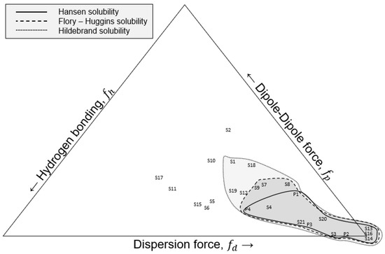 Teas graph of various plastics and solvents according to the hydrogen bonding, dipole–diploe force, and the dispersion force, respectively. Lines show the boundary conditions for three models including the Hansen solubility sphere, the Flory–Huggins solubility, and the Hildebrand solubility.