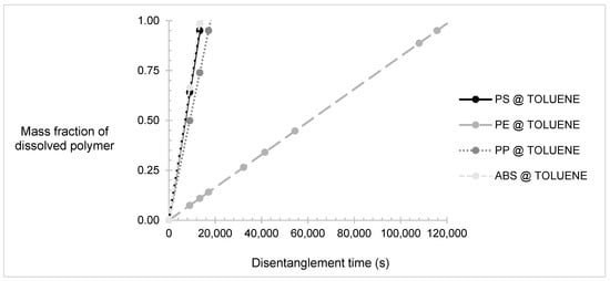 The mass fractions of plastics dissolved over time in toluene are presented in Figure 3. The reptation time was assumed to be negligible in relation to the dissolution time; therefore, Equation (23) was simplified to: