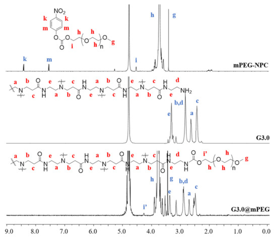 The G3.0 was synthesized step by step via Michael reaction and amidation reaction. Subsequently, NPC-activated mPEG was conjugated on G3.0 surface to form G3.0@mPEG and release nitrophenol. The chemical structure of G3.0, mPEG-NPC, and G3.0@mPEG was characterized by 1H-NMR and FT-IR. The 1H-NMR and FT-IR results were shown in Figure 1 and Figure 2 below, respectively.