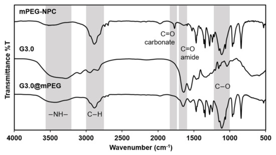 Figure 2 showed the FT-IR spectrum of mPEG-NPC, G3.0 and G3.0@mPEG. In the spectra of mPEG-NPC, the peak at 2888 cm−1 was C-H stretching vibration, the peak at 1114 cm−1 was the C-O asymmetric stretch and the peak at 1768 cm−1 indicated vibration of C=O stretch of carbonate group [35,36]. In spectra of G3.0, the appearance of peak at 3415–3265 cm−1 was attributed to secondary amine group (-NH-). The strong peak at 1645 cm−1 was C=O stretch of amide group, and the one at 1556 cm−1 was N-H bending vibration. In the spectra of G3.0@mPEG, there were peaks of G3.0 at 3345–3356 cm−1 (N-H) and 1641 cm−1 (C=O of amide); and peak of PEG at 1112 cm−1 (C-O) [35,37]. Besides, the disappearance of peak at 1768 cm−1 was due to the replacement of carbonate group by carbamate group, which demonstrate that PEG was conjugated with G3.0 [36].