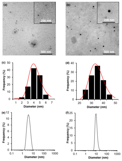 The morphology and particle size of dendrimer G3.0 and G3.0@mPEG was shown in Figure 3. Obviously, the TEM images (Figure 3a,b) showed that both G3.0 and G3.0@mPEG particles were sphere. The particle size from TEM images was measured using ImageJ software, then calculated and expressed as mean ± standard deviation, which were 4.3 ± 0.9 nm for G3.0 and 34.5 ± 4.6 nm for G3.0@mPEG. The comparison of the particle size between G3.0 and G3.0@mPEG using one-way ANOVA showed that the two particle sizes were statistically different with p < 0.005. Meanwhile, the hydrodynamic size of G3.0 and G3.0@mPEG were determined by dynamic light scattering technique (DLS) with 5.8 ± 0.6 nm for G3.0 and 123.5 ± 5.2 nm for G3.0@mPEG. Both TEM and DLS results of G3.0@mPEG were bigger than those of G3.0 due to the mPEG layer conjugating on G3.0 surface. This layer not only holds more drugs but also enhances the blood residence time of the particles [22]. However, the DLS results were bigger than the diameter measured by TEM, which was explained due to the solvate layer around the particle in DLS measurement [37].