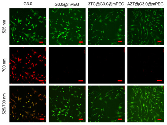Images of AO/PI dual stained BJ cell line treated by G3.0, G3.0@mPEG, 3TC@G3.0@mPEG and AZT@G3.0@mPEG solutions at 200 µg/mL within 24 h, observed under 525 and 700 nm laser channels. The scale bar is 150 µm.