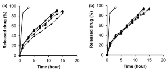 Release profile of free and loaded 3TC (a) and AZT (b) in 4 different pH conditions. Empty circle: free drugs at pH 7.4; Solid circle: loaded drugs at pH 1.2; Solid square: loaded drug at pH 4.5; Solid triangle: loaded drugs at pH 6.8; Solid diamond: loaded drugs at pH 7.4.
