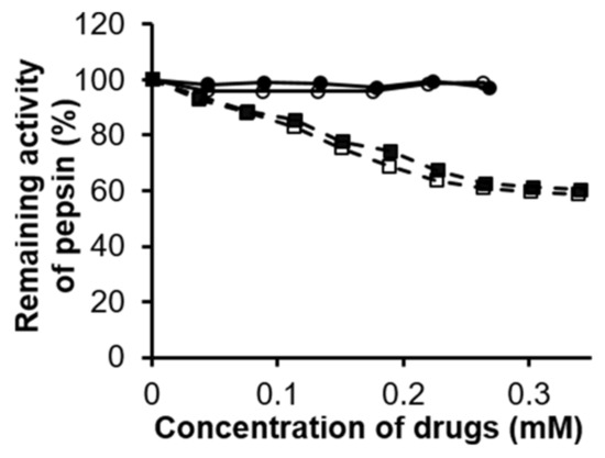 The pepsin inhibition activity of the samples was expressed as a percentage of remaining activity of pepsin in comparison to the test at 0 mM of drug (taken as 100%), using the following Equation (6):