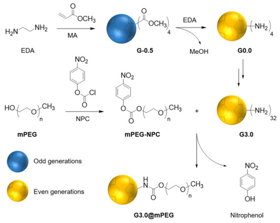 Before being conjugated with G3.0, mPEG was firstly activated with NPC. The mPEG was melted in a three-neck round bottom flask at 60 °C for 2 h under nitrogen flow. NPC was quickly added into completely melted mPEG, then the mixture was magnetically stirred for 6 h at 60 °C, dissolved in THF and kept for 6 h at room temperature. The activated mPEG was crystallized in cold diethyl ether, filtered by Buchner funnel, and dried by rotary evaporator.