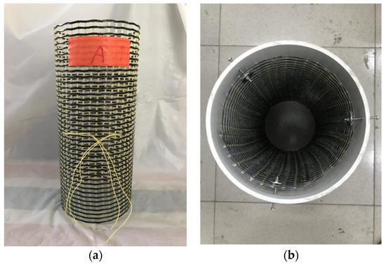Figure 3 shows the procedure of specimen preparation. The CFRP grid-reinforcing cage with designed dimensions was prepared (Figure 4a). This CFRP grid-reinforcing cage was then put in the formwork assembled by a central foamy cylinder and an external PVC tube (Figure 3b). The position of the CFRP grid-reinforcing cage, the foamy cylinder, and the PVC tube were fixed before UHPC casting (Figure 3c). For concrete-filled FRP grid-UHPC tube columns, the ready FRP-UHPC tubes were subsequently filled with ready-mix commercial concrete provided by a local supplier.