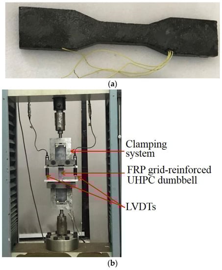 FRP grid-reinforced UHPC dumbbell and tensile test set-up. (a) FRP grid-reinforced UHPC dumbbell; (b) Tensile test set-up.