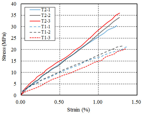 Tensile tests on FRP grid (one-ply)-UHPC were also conducted to look at the tensile properties of UHPC by direct tensile tests of dumbbell samples. The dumbbell samples (Figure 4a), which were prepared using steel molds, had a thickness of 13 mm and consisted of a central test region of 80 mm length and 30 mm width (Figure 4a). The ends were expanded in width to ensure a better transfer of the tensile loading from the testing machine to the sample [69]. The tensile tests were conducted at a loading rate of 0.5 mm/min. A pair of linear variable displacement transducers (LVDTs) were used to record the tensile deformation in each specimen (Figure 4b). The dumbbell samples under tensile loading generally failed at the middle-length region, and some micro cracks developed in the transverse direction of the sample during the tests, while only one major crack was seen after the tests. Figure 5 shows the tensile stress–strain curves of the three UHPC dumbbell samples reinforced with one-ply CFRP grid (T1) or two-ply CFRP grid (T2). It can be seen from Figure 5 that the tensile stress–strain curves of FRP grid-UHPC samples exhibit a linear elastic tensile stress–strain behavior until failure.