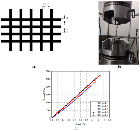 The CFRP grid-reinforcing cages were fabricated in the laboratory using the wet layer-up approach by wrapping a mold with epoxy-infiltrated carbon fiber grid. The dimensions of the carbon fiber grid are shown in Figure 6a. Tensile tests on three one-ply CFRP grid coupons (Figure 6b) were conducted to understand their tensile properties. Each end of the FRP grid coupon was anchored with aluminum plates using a two-part epoxy. A constant displacement rate of 1.5 mm/min was adopted in the tension tests on the CFRP grid samples [74]. The failure mode of the CFRP grid coupons was fracture at the mid-length region, while the resulting tensile stress–strain curves of the CFRP grid coupons (based on the actual nominal cross-sectional area of the FRP in the grid) exhibit a linear behavior until failure (Figure 6c).